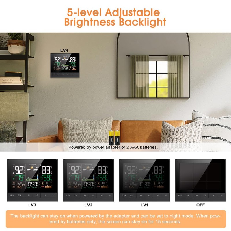 - 5 Levels Adjustable Backlight: Digital weather station adopts a VA-LCD for good color contrast and wide viewing angle. You can hang it on the wall or place it on a table for easy viewing. EM3403 is designed with user-friendly front buttons that make it easy to operate. When weather station clock is plugged into adapter, you can adjust backlight to 5 levels as needed, also you can set the brightness level of night mode. To save power, the screen stays on 15 seconds when only powered by batteries