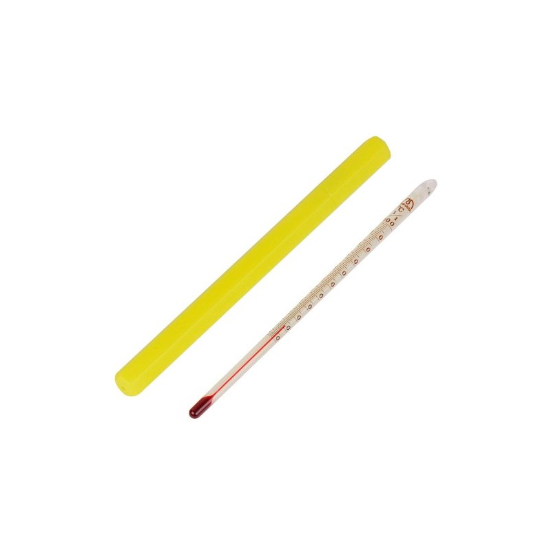 - Material: Thermometer body: Glass, Red liquid / Petroleum type, Case: Polyethylene
