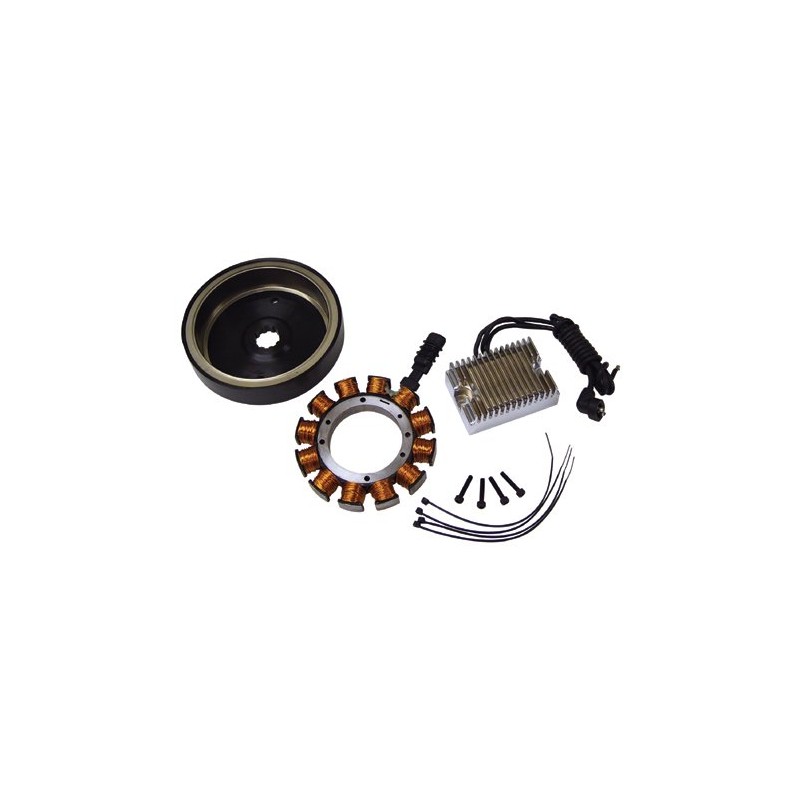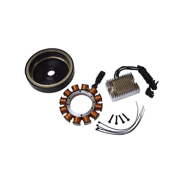 - ''' These systems are the perfect choice when building a bike from scratch or when upgrading your weaker charging system#||# The alternator rotors feature fully encased sets of magnets that have no way of working loose like OEM rotors are known to do. Instead of having just six long magnets like OEM rotors, these rotors have 12 short magnets to match the number of laminated windings found on the stators#||# Features standard spline rotor with two rotor spacers#||# Fits Big Twin models 1970/1999 (except Twin Cam & EFI models)#||# All systems include a chrome plated regulator/rectifier'''