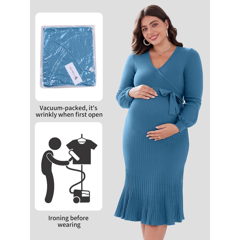 V FOR CITY Maternity Dress for Baby Shower Photoshoot Pleated Bodycon Midi Knit Sweater Dresses Blue Small
