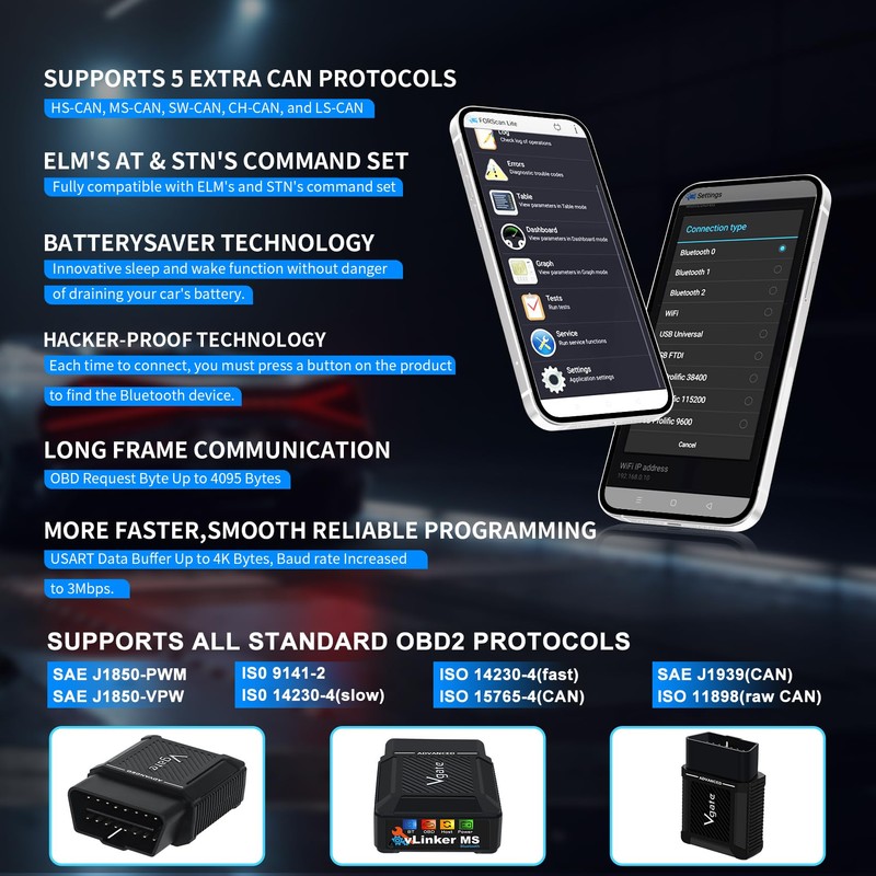 - [Supports 5 Extra Can Protocols]: In addition to all of standard OBD2 protocols, vLinker MS Bluetooth OBD2 adapter for HS-CAN, MS-CAN, SW-CAN, CH-CAN, and LS-CAN. Which can be compatible with more car models and provide more choices for customers.