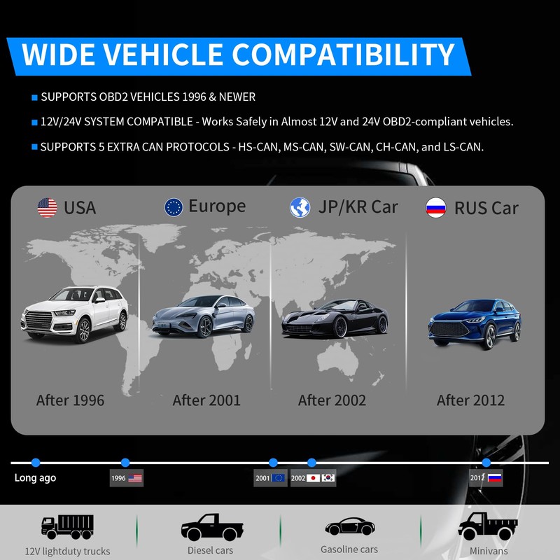 - [Wide Vehicle Compatibility]: vLinker MS Bluetooth (Apple MFI Certified) works with all 1996 and newer 12V/24V petrol vehicles compatible with standard OBD2 protocols, and all 1996 and newer 12V/24V small diesel vehicles with a load of 6.5T or less that support OBD2 protocols.
