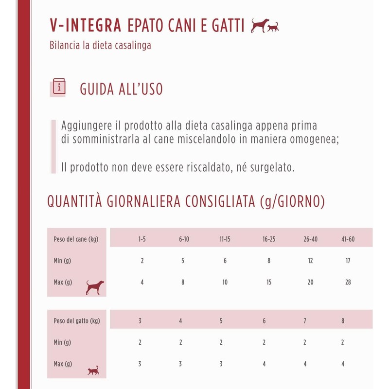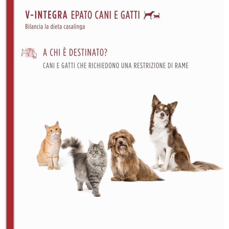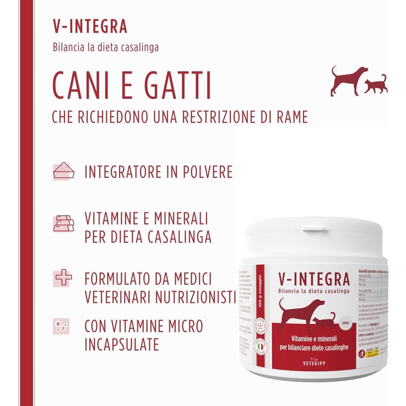 - V-INTEGRA EPATO is the vitamin and mineral supplement formulated to balance the homemade diet of dogs and cats that require copper restriction. Contains a low copper content, delivers high amounts of zinc to promote the excretion of copper, contains vitamin E with antioxidant effect. It contains no protein, so it is suitable for people with food allergies.