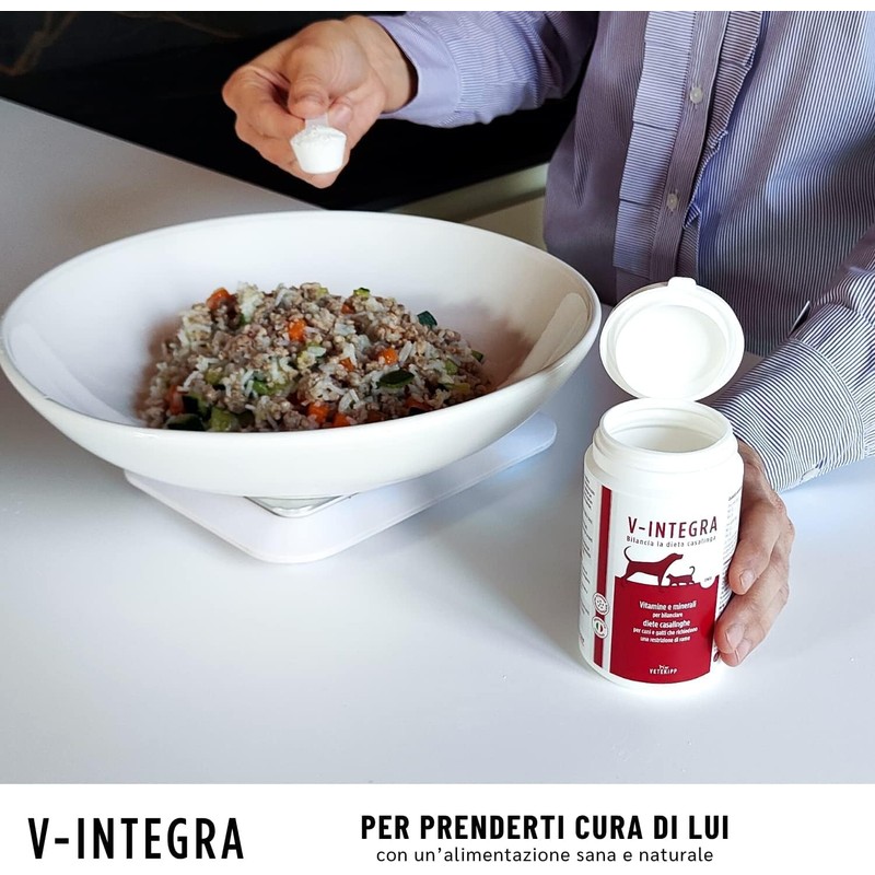 - Dietary supplement made from the highest quality raw materials, with full respect for the health and well-being of the animal. V-INTEGRA products have been formulated by veterinarians nutritionists as part of research projects of the University of Padua. This line comes from our deep love for animals: we strive to put our time and expertise at the service of their well-being.