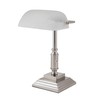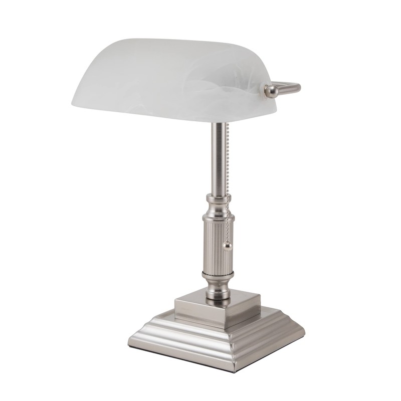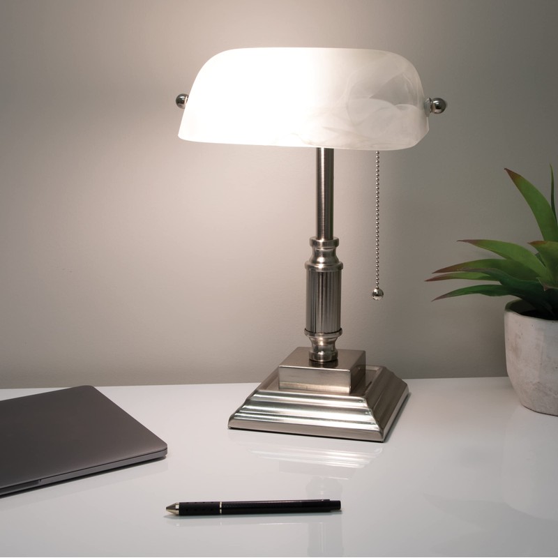 - TRADITIONAL BANKERS LAMP: A vintage lamp designed with comfort in mind. The curved, white glass shade reduces eye strain from harsh light