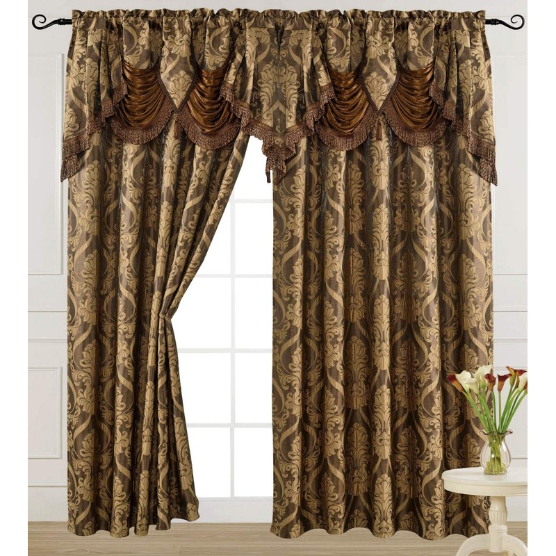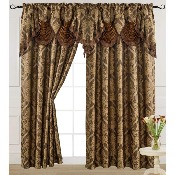 V Luxury Jacquard Curtain Panel with Attached Waterfall Valance, 54 by 84-Inch Ashley Light Brown