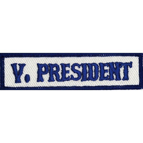 V. President V. President Biker Title Rank Tag Embroidered Iron On Patch White Blue