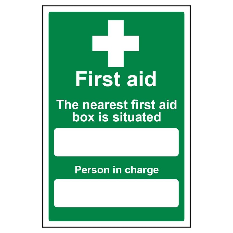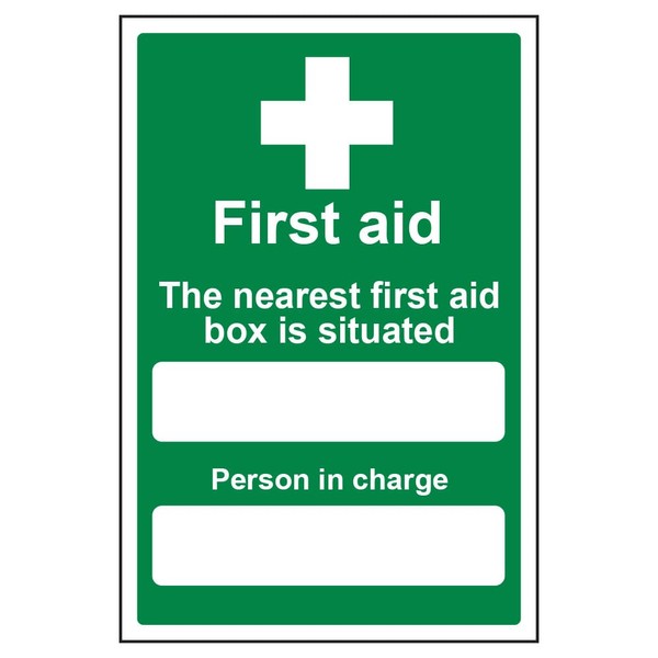 - Portrait Orientation. Sign reads "The Nearest First Aid Box Is Situated. Person In Charge"