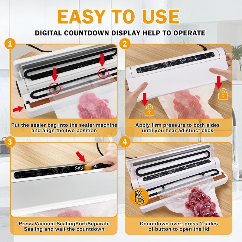 - ✅ 【Powerful Suction & Rapid Sealing】 Experience professional-grade preservation with a robust motor that achieves a strong vacuum, removing air in just 10-15 seconds. This fast, efficient process locks in freshness much more effectively than weaker, slower sealers, ensuring your food stays protected from the moment you seal it.