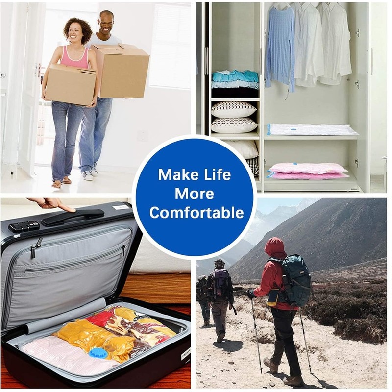 Free Travel Pump Included! When you travel and want to maximize space so that you don't have to carry a lot of luggage, these storage bags are perfect! When you have to repack for the return journey, just use our free and convenient travel pump, and your luggage will be airtight and vacuum - packed again!