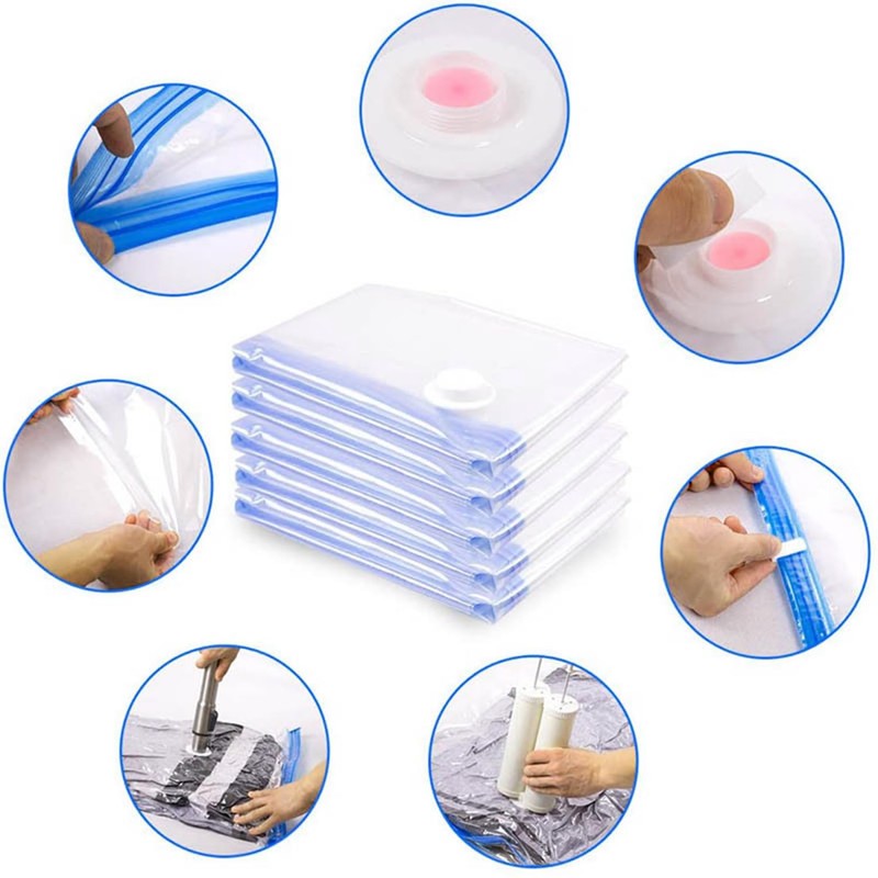 6 packs of vacuum storage bags with a suction pump, 3 different sizes, reusable compression bags that save space, used as vacuum bags for packing, clothes, bedding, and travel.