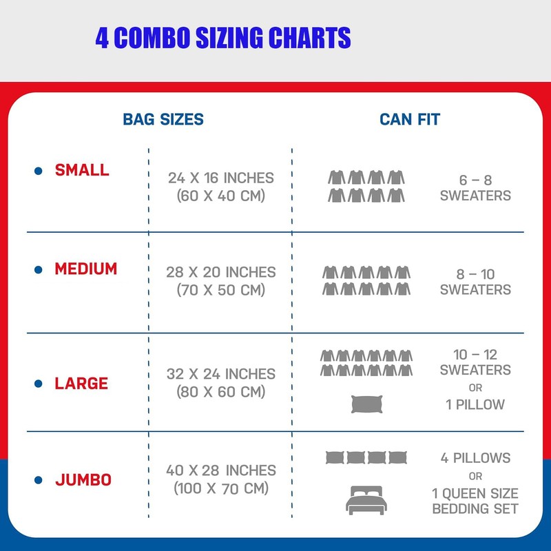 Pack Includes:7-piece set,2 Small(40×60cm),2 Medium(50×70cm), 2Large(60×80cm),1Jumbo(70×100cm) Portable hand pump is included in the package.