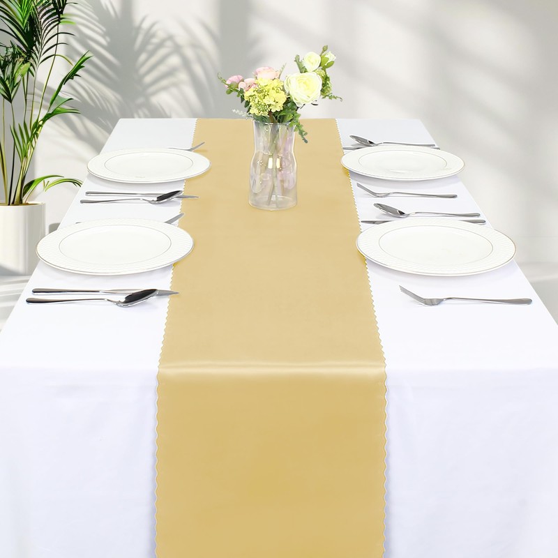 - What Will You Receive - 12 x Gold Satin Table Runner, Shape: Rectangular, Size: 12 x 72 Inches. Satin rectangle table runner can be used for Halloween, Valentine's Day, Christmas, wedding anniversary and other holiday decorations, as well as for the daily decoration of hotel, family restaurant, kitchen, etc.