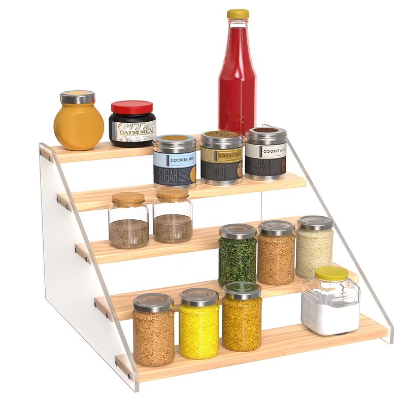 - MATERIAL - The countertop spice rack is made of transparent acrylic and wooden boards. The novel design fits any style of your kitchen.