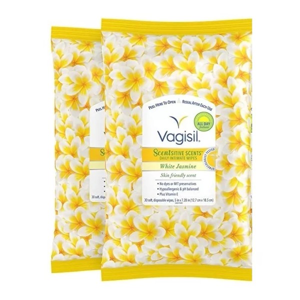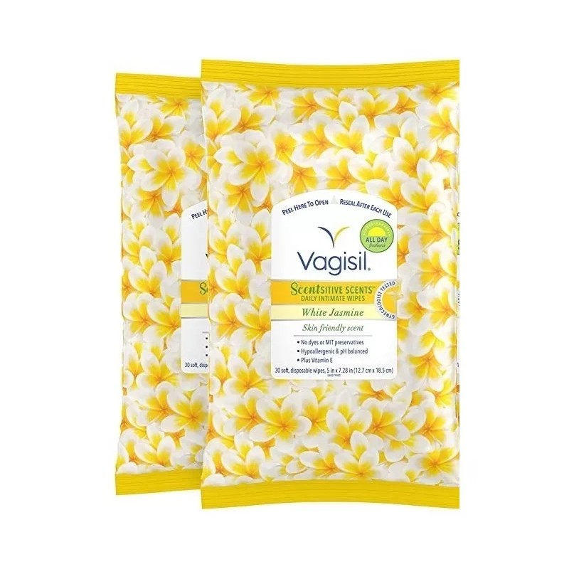 Incluye: Incluye 2 paquetes de 30 toallitas femeninas Vagisil cada uno, suaves y desechables con aroma a jazmín.