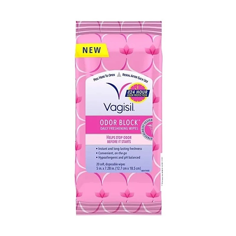 Incluye: 1 paquete de 20 toallitas bloqueo de olores femeninas suaves y desechables de Vagisil para una frescura duradera.