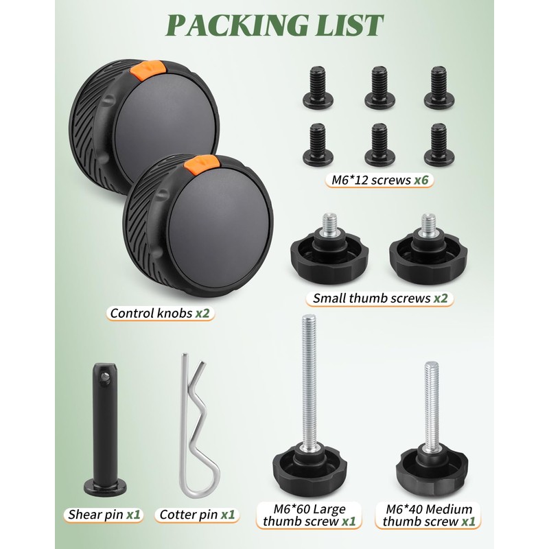 - Package Contents: 2*control knobs, 6*M6x12 screws, 2*small thumb screws, 1*M6x60 large thumb screw, 1*M6x40 medium thumb screw, 1*cotter pin, 1*shear pin
