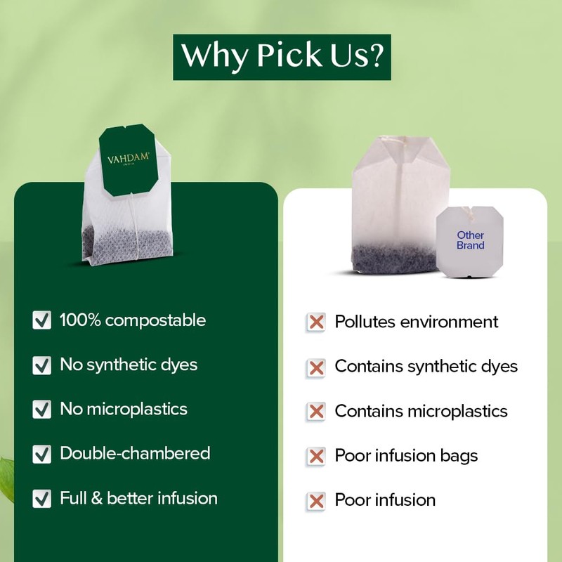 - Plastic-Free and Eco-Friendly: Savor your tea with VAHDAM's eco-friendly filter-paper tea bags made from 100% wood pulp. Free from micro-plastics, harmful chemicals, and toxins, these tea bags ensure a safe, guilt-free brewing experience.