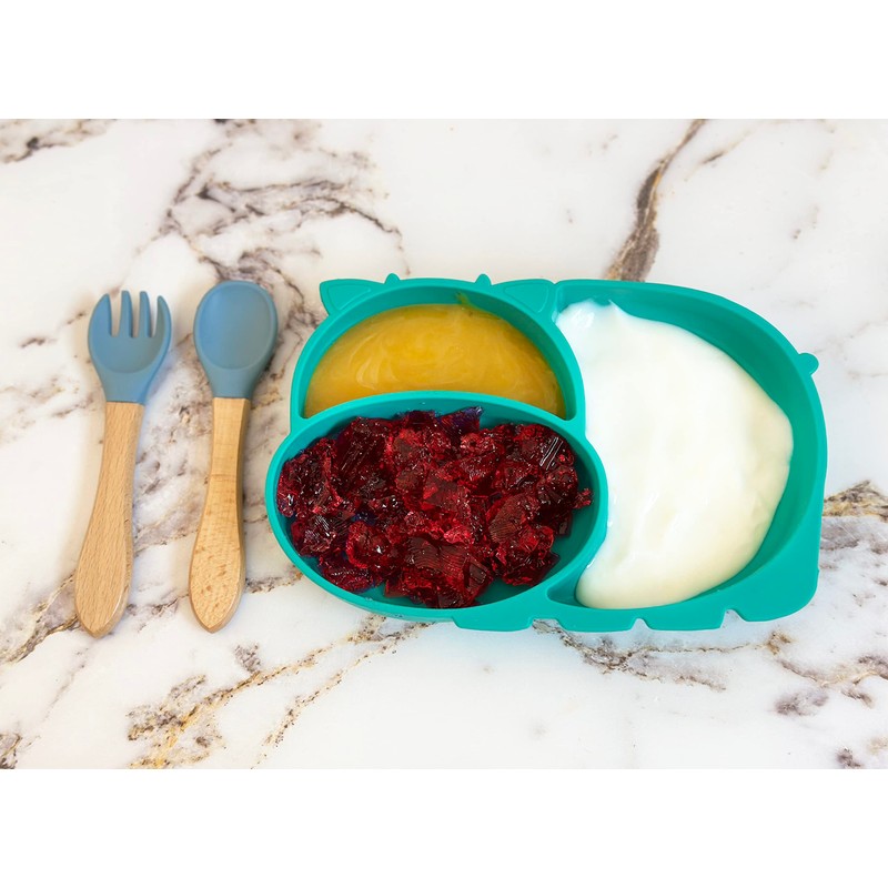 Vajilla para Bebé con Cubiertos; Plato Adherente con 3 Divisiones y Cubiertos (Verde)