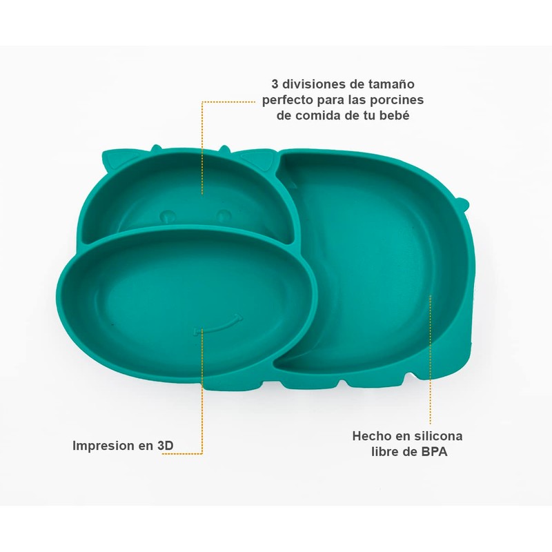 Plato para bebé con tres divisiones del tamaño perfecto para sus porciones de comida. Ideal para papillas, fruta, pure, verduras y más. Los cubiertos son hechos en silicona en grado alimenticio libre de BPA y madera. Cuchara y tenedor del tamaño ideal para sus manos. Plato hecho en silicona en grado alimenticio libre de BPA. Soporta altas y bajas temperaturas. Cuenta con una base que se adhiere a superficies planas, lisas y limpias, libres de grasa, polvo y suciedad. Diseño de Hipopótamo con impresión en 3D.