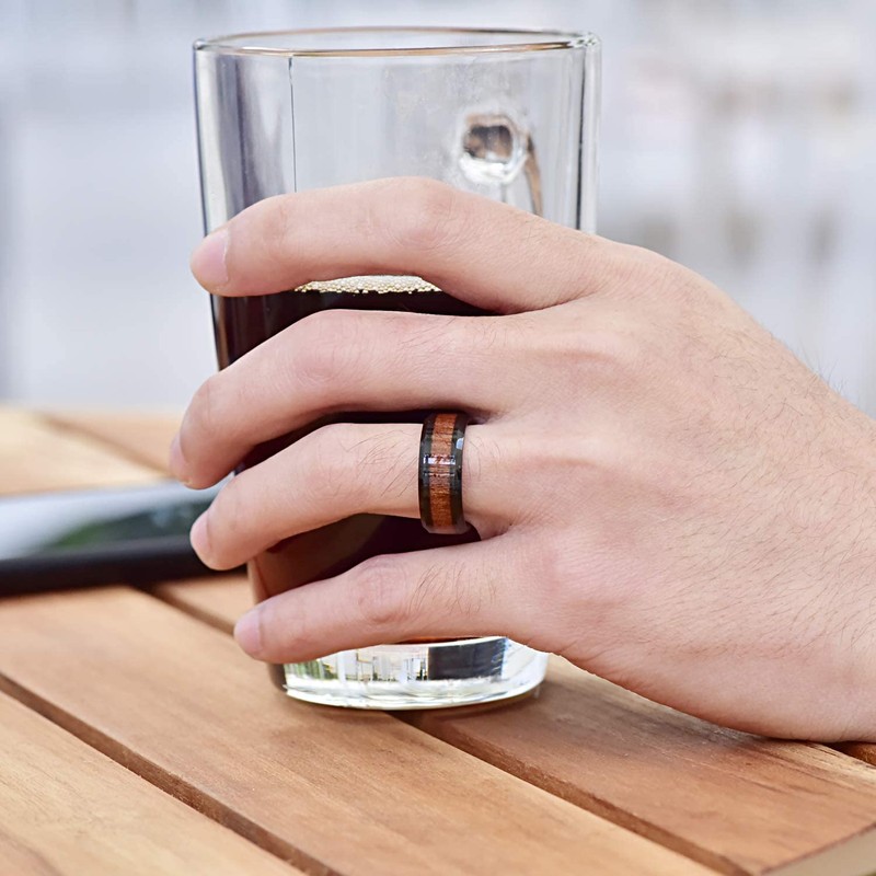 - Design:Hawaiian koa wood inlay black plated polished finish beveled edge comfort fit wedding band ring