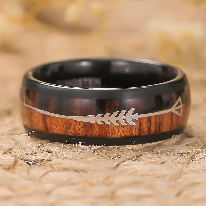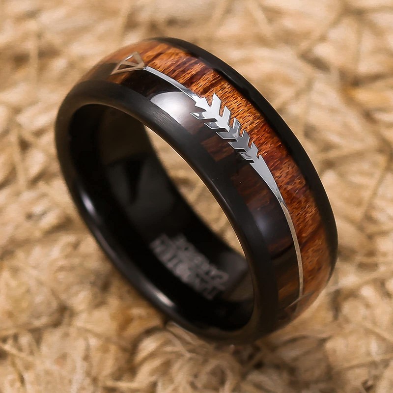 It features a rounded & comfort fit inner face with Hawaiian koa wood and silver arrow inlaid into the ring surface.