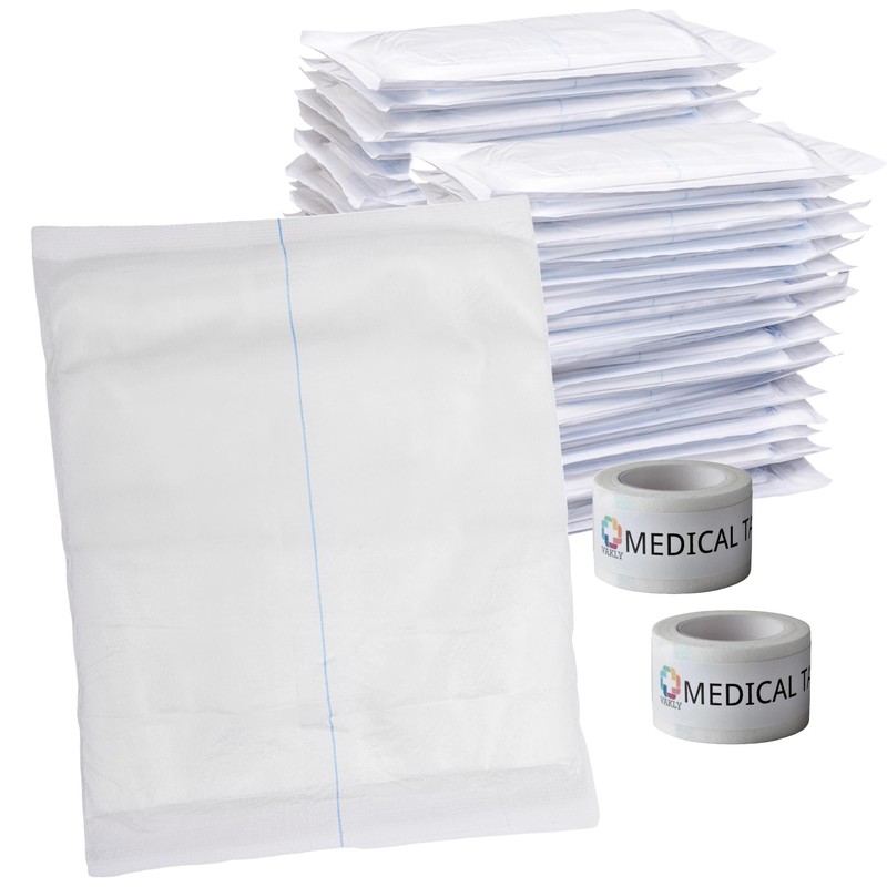 - TAPE INCLUDED - Each pack of the 5'x9' combine abdominal pads comes with a roll of medical tape. Rolls of tape are 1' wide and 10 Yards long and tears easily without shredding.
