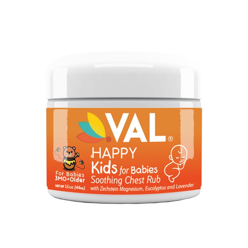 • SOOTHING CHEST RUB: VAL Happy Kids TM petroleum-free chest rub for babies features a blend of eucalyptus & lavender oils in a beeswax & shea butter balm; helps soothe baby without harsh chemicals or toxins.