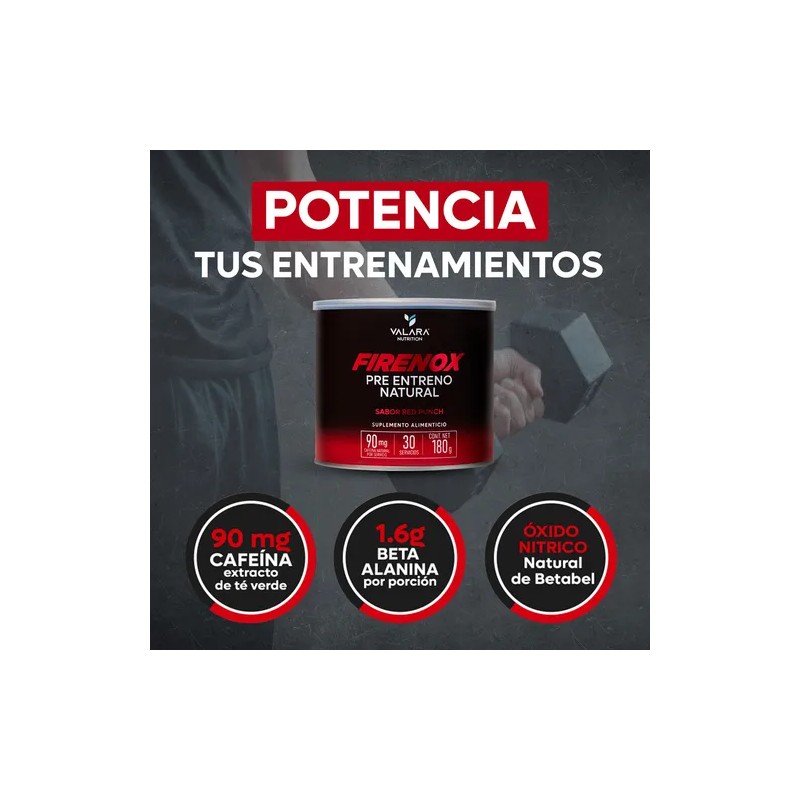VALARA Firenox Red Punch - Pre-Entreno en Polvo 180 g - Suplemento Alimenticio Natural - Sabor Ponche - Beta Alanina - 30 Servicios - Gym, Entrenamiento