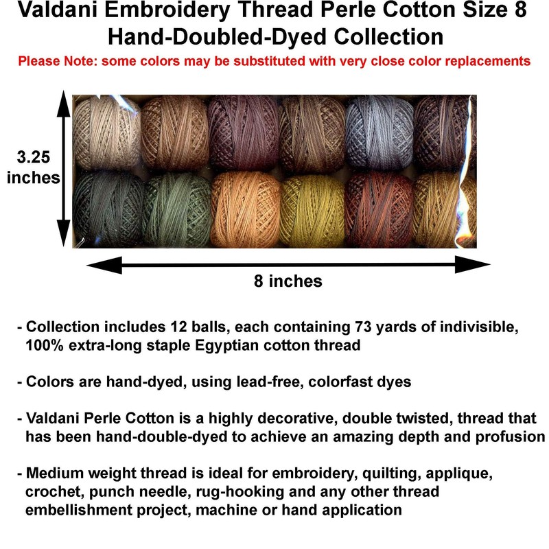 - Includes 1 complete set of Valdani Perle Cotton Size 8 Embroidery Thread Earthly Treasures Collection containing 12 balls, 1 ball each of O31, O145, O531, O548, 196, O178, O154, O547, 039, 041, O153, O217 (please note that some colors may be substituted with very close color replacements); includes Seam Ripper and Needle Threader