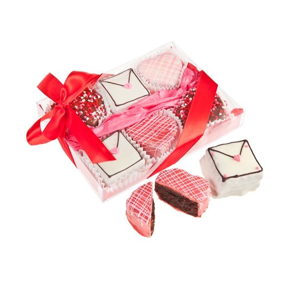 Valentine's Gift Box of 6 Brownies! Each Dense Rich Brownie is baked fresh daily from our own recipe and will leave you wanting more. Cut into festive Heart & Letter shapes and hand dipped and decorated in delicious gourmet Belgian Chocolates for the perfect Sweet Treat! Each Brownie treat is placed inside a clearview gift box and sealed with a lush red satin ribbon!