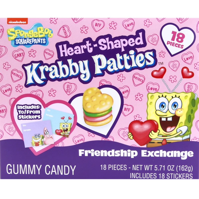 Valentine's Day 2024 SpongeBob SquarePants Krabby Patties Exchange Box, Individually Wrapped Heart Shaped Gummies with To/From Stickers, Pack of 2, 36 Total