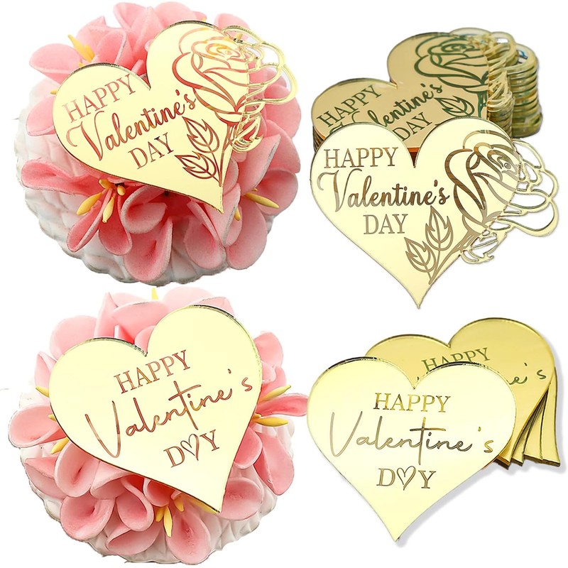 Festive Decorations: 12 Pieces Rose and 12 Pieces Heart acrylic heart-shaped cupcake toppers with 'Happy Valentine's Day' engraving;