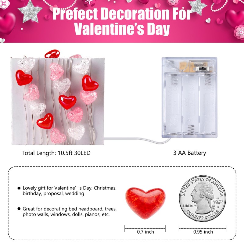 - 【 Delightful Warm Glow】- The battery-operated string lights are 10.5 feet long with 30 mini red pink white heart-shaped LEDs. The thin copper wiring and smaller-sized LED bulbs add a delicate and romantic touch to your indoor/outdoor space