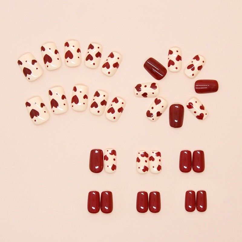 - Package: You'll get 24 Valentine's Day false nails in 12 sizes. 1 mini nail file, 1 small wooden stick, 1 piece of adhesive tab glue. You can safely choose a fake nail that fits your finger size and DIY your desired nail shape