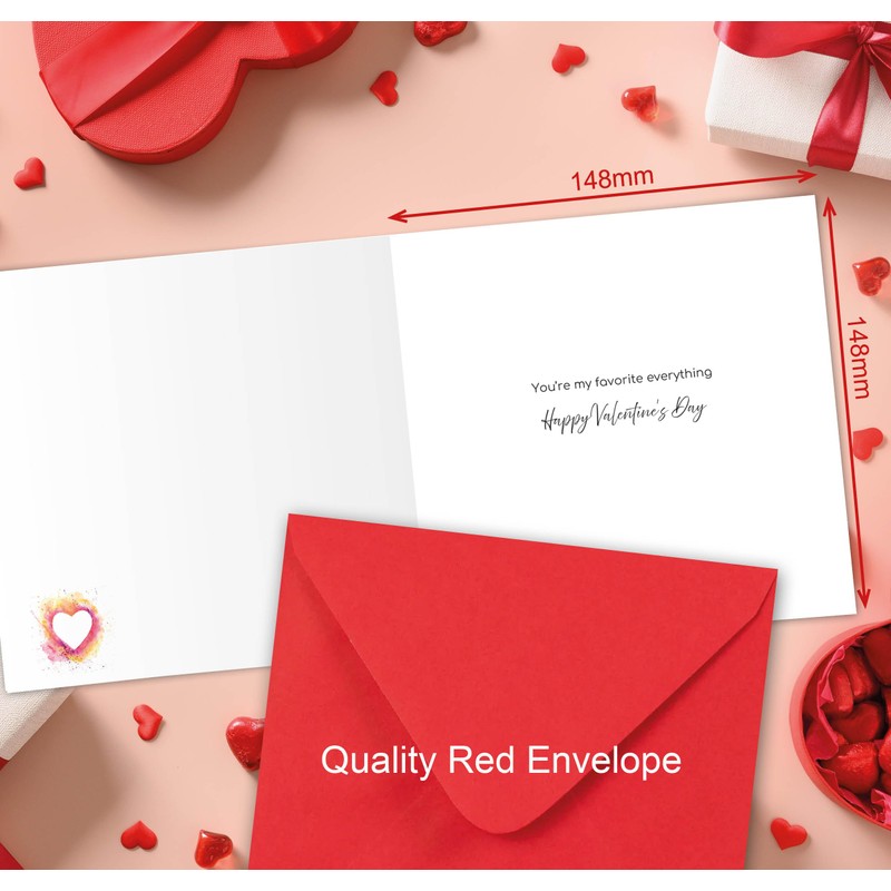 - VALENTINE CARD - 148 x 148mm when folded. Card supplied folded and individually wrapped with red envelope.