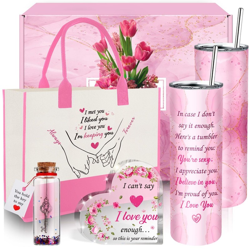 - 【EXCELLENT PACKAGING】All the accessories of this Valentine's Day gift basket are packed inside a pink gift box, when you receive the gift one will be amazed by the lovely packaging, and the person who receives the gift will be surprised and touched when he or she opens the gift box. The gift box contains a large capacity canvas bag, a 20 ounce pink insulated tumbler, an I LOVE YOU acrylic heart desktop sign, and a cute Valentine's Day jar. This pairing is simply delightful!