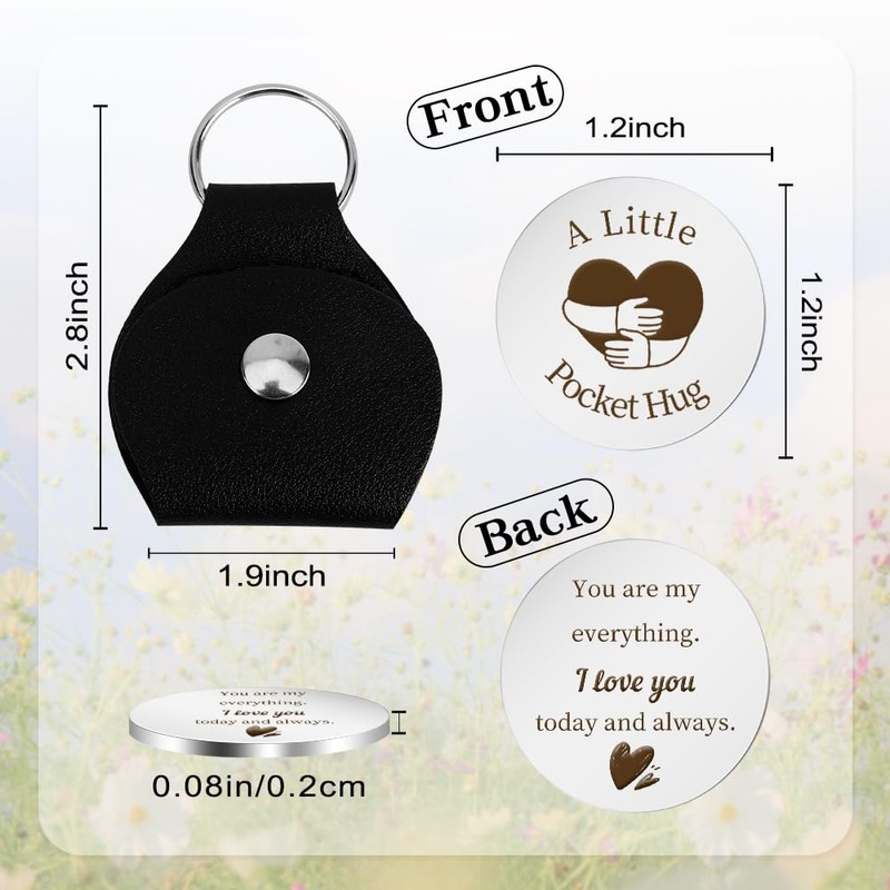 - Valentines Gifts for Husband: Our double sided pocket hug token is a dismeter of 1.18 inch disk with a PU leather package which is 6.5 x 4.7 cm / 2.55 x 1.85 inch that can be easily put into your pockets, bags, wallets and more. made of stainless steel, which is not easy to corrode and rust. You will receive 1 piece of stainless steel pocket hug token and 1 piece of PU leather keychain