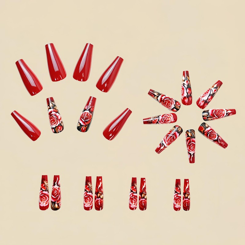 Valentines Press on Nails Long Coffin SWEKKE Red Fake Nails Flower False Nails with Designs Rose Floral Glossy Glue on Nails Valentine Acrylic Nails Stick on Nails for Women Girls 24 Pcs