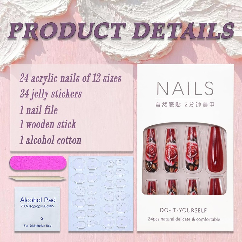 - Package Includes: 24 pieces Valentines fake nails, 1 sheet of 24 pieces jelly glue, 1 piece of mini nail file, 1 piece of wooden stick and 1 piece alcohol pads. Crafted from durable acrylic, enjoy long-lasting use without worrying about chipping or fading.