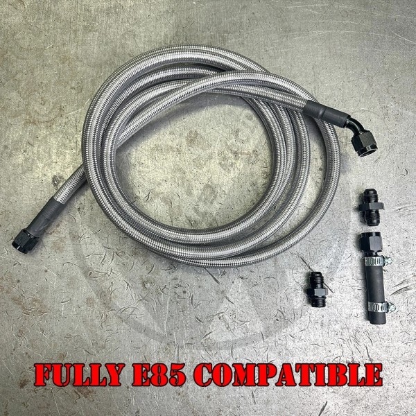 For sale is a complete E85 compatible stainless steel -6 AN replacement fuel return line that runs from the fuel tank to the fuel pressure regulator. Perfect replacement for rusty and leaky factory lines or performance replacement for higher horsepower applications running E85.