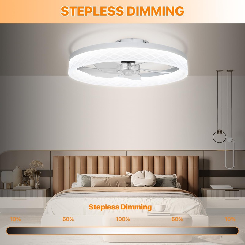 - Smart Adjustable Lighting: Featuring adjustable color temperatures from 3000K to 6500K and stepless dimming, this flush mount ceiling fan with lights caters to diverse needs. Whether you prefer a warm glow for relaxation, a bright white for reading, or a neutral tone for gatherings, it provides the perfect lighting for every occasion. High-CRI LED bulbs reproduce true-to-life colors, creating a naturally illuminated atmosphere for your home