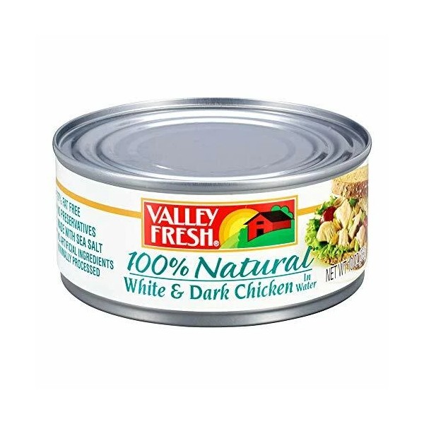 At VALLEY FRESH, we know it?s important to feel good about what you eat. That?s why our canned chicken starts with 100% natural ingredients: white and dark chicken meat, broth, rosemary, and sea salt. When it comes to canned chicken, simple ingredients and minimal processing mean great taste. Each serving contains 9 grams of protein, making it a good source of protein. Whether it?s traditional chicken recipes, like your mother's favorite chicken salad, or something new, like chipotle chicken nacho bites, you?re going to love the chicken you serve. VALLEY FRESH is a trademark of Hormel Foods, LLC.