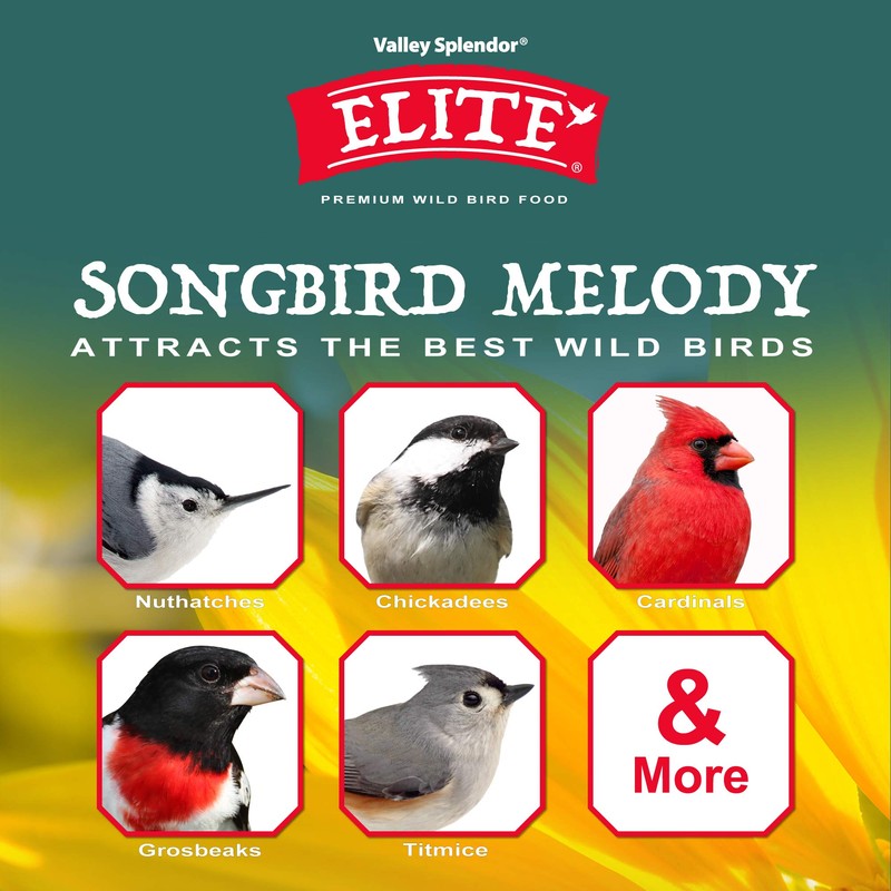 Your backyard birds will surely sing a happy tune when you feed them Elite’s Songbird Melody Bird Food! Loaded with black oil sunflower seeds, tempting peanuts and sweet raisins, this irresistible blend is specially formulated to attract more of nature’s most talented singers to your feeder. It’s specially formulated to be high in protein and fat to provide the energy your feathered friends need, and added vitamin A and D3 help them grow, reproduce and thrive. Infused with a fragrant berry scent, this gourmet buffet will have cardinals, blue jays, nuthatches, finches, woodpeckers and more flocking to your feeder. Ingredients: Black Oil Sunflower, Safflower, Peanut Pieces, Striped Sunflower, Raisins, Vitamin A & D3 Supplement