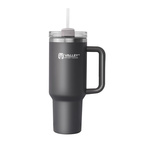 Valley Sportsman 40 oz Stainless Steel Tumblers with Handle, Spill-proof Lid and Straw, Double-Walled Insulated, BPA-Free, Perfect for Hot and Cold Drinks, Gray