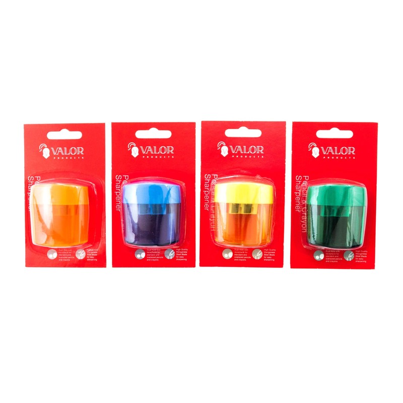 - VALOR PRODUCTS 2 Holes Pencil & Crayon Sharpener: Includes 288 Pieces cute colored pencil sharpeners, transparent boxes of 4 colors: orange, yellow, blue and green, each color have 72 pieces.