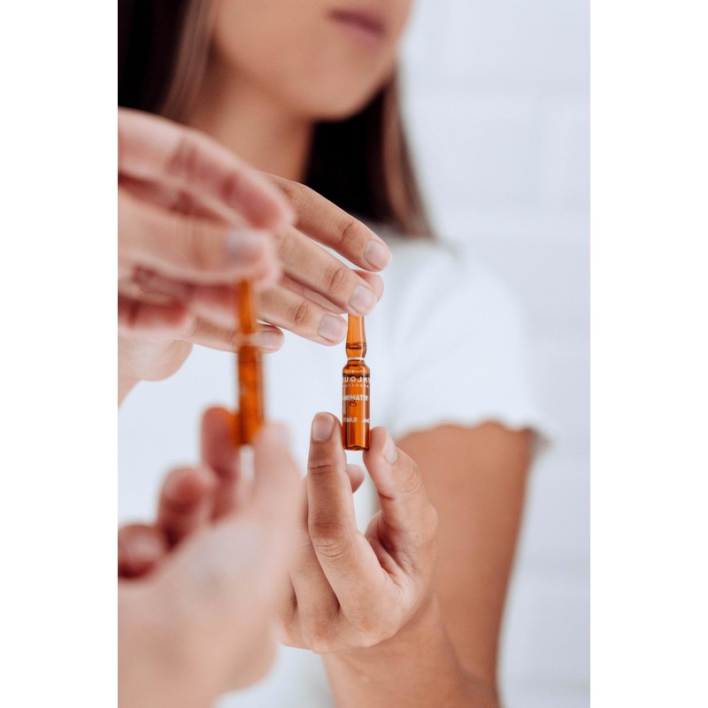 - Gesichtspack Vitamin C und Hyaluronsäure. Enthält 40 ml Serum und 5 Ampullen à 2 ml. Schützt, belebt und befeuchtet die Haut und sorgt für ein strafferes und strahlenderes Gesicht ohne Rötungen oder übermäßigen Glanz.