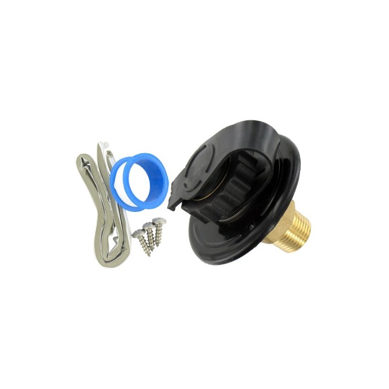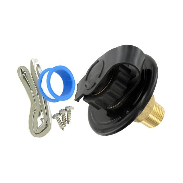 - Fresh Water Inlet; Used For RV Fresh Water System; Flush Mount; 1/2 Inch Male Pipe Thread Inside Connection; 2-3/4 Inch Flange; 2-3/4 Inch Overall Diameter; With Check Valve; Black; Lead Free Brass; With Check Valve/ Garden Hose Swivel Fitting With Gripper/ Press-In Dust Plug and Installation Tape and Hardware; With Retail Package