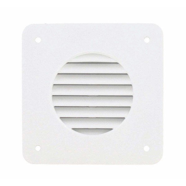 Use To Direct Battery Box Fumes Outside For Safety; Louvered Vent Cover; 4-1/4 Inch Length x 4-1/4 Inch Width Outside Dimension; Accommodates 1-3/4 Inch Hose; White; Plastic