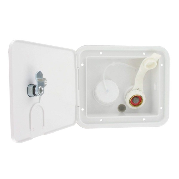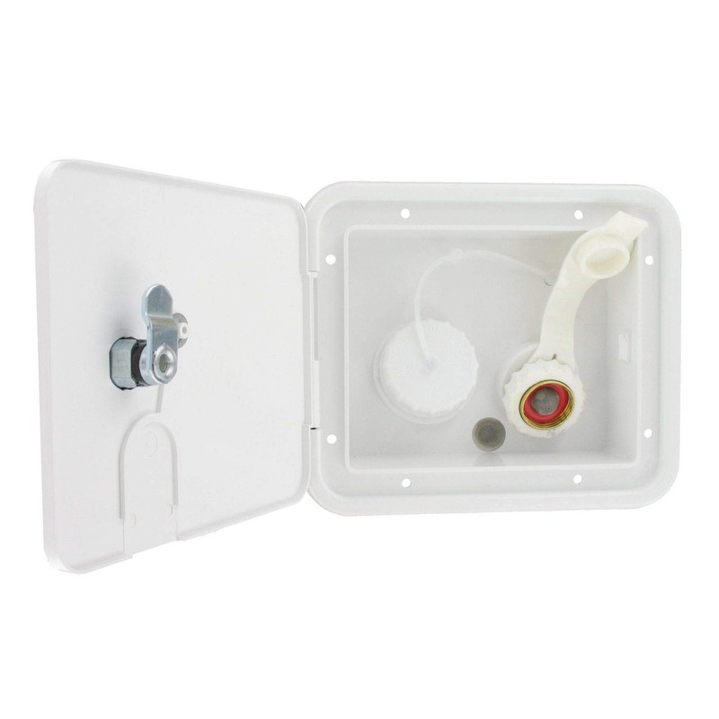 - Gravity/city water lockable hatch that used for filling the water holding tank with gravity (meaning it does not have a threaded connection) or a city water threaded connection with a garden hose.